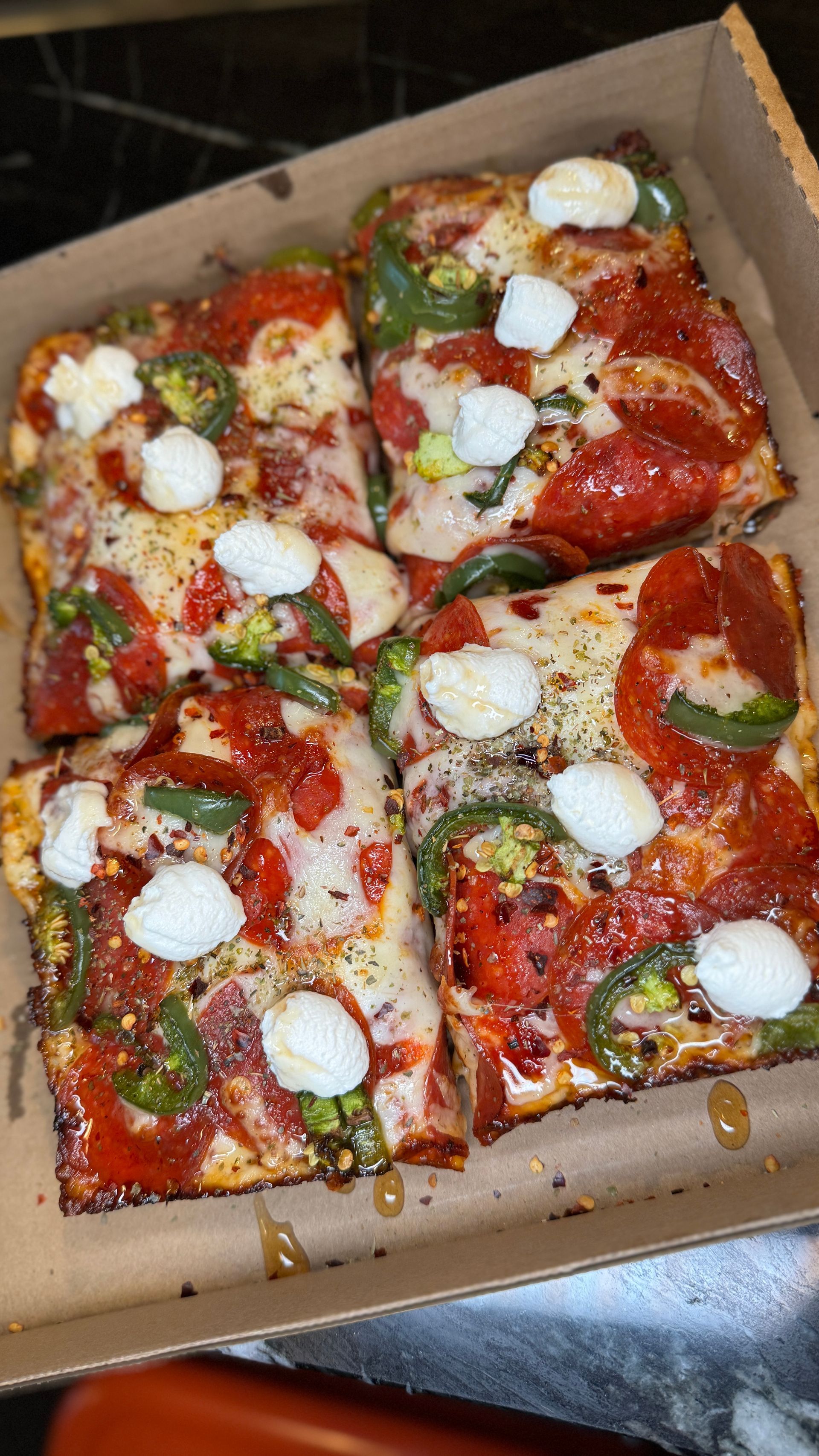 This is the breakout star. The Jalapeño Ricotta Hot Honey pizza is the flavor combination that takes Detroit-style pizza to a more creative place. It hits every craving all at once: sweet, spicy, creamy, savory, and aromatic.