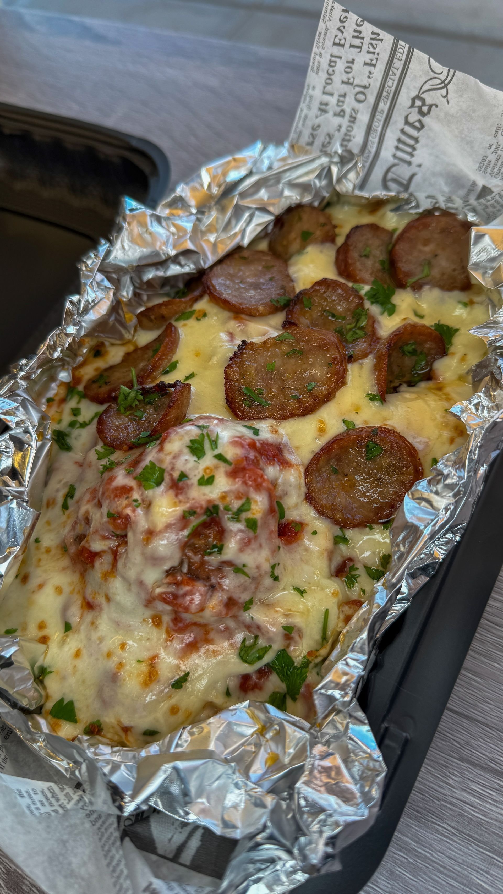 Picture this: spaghetti tossed in both Alfredo and meat sauce, topped with a full-sized meatball, slices of Italian sausage, and a generous blanket of mozzarella. Then the whole thing is toasted until it’s bubbling, golden, and irresistibly melty.