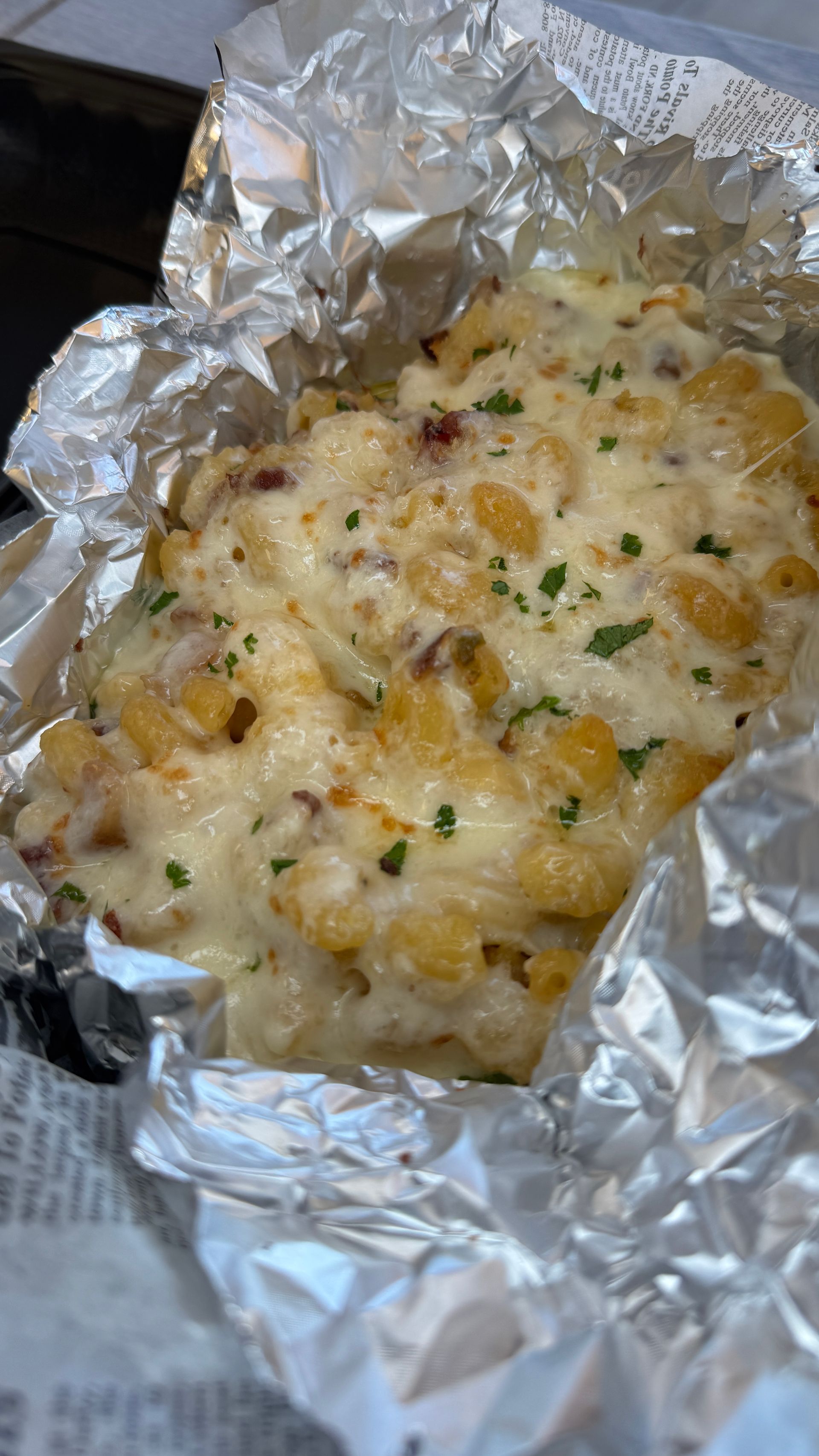 Spaghetti Shark takes cavatappi pasta, the curly, ridged noodle that clings to sauce like it was designed for cheese worship, and bakes it in a cheddar and pepper jack mornay. That means this sauce isn’t just melted cheese; it’s a professionally built cheese sauce thickened with a roux, enriched with cream, and seasoned for flavor balance.