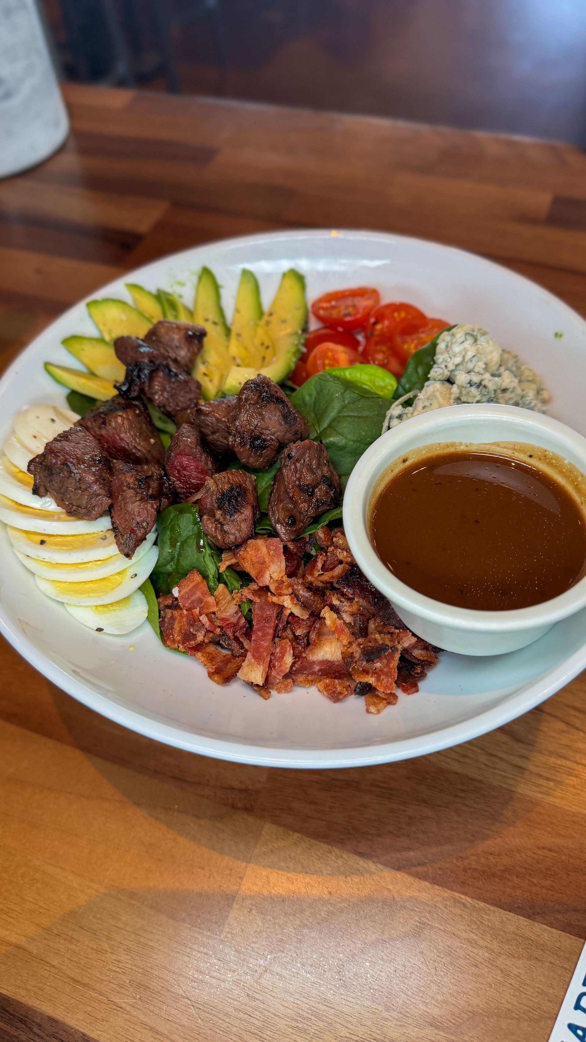 This dish is one of the standout items on the reimagined menu. The steak salad is hearty enough to satisfy someone craving a full meal, but balanced enough to feel fresh. It is built on baby spinach, which adds a tender, leafy base. Avocado brings creaminess. Bleu cheese adds tang and richness. Bacon gives it a smoky finish.