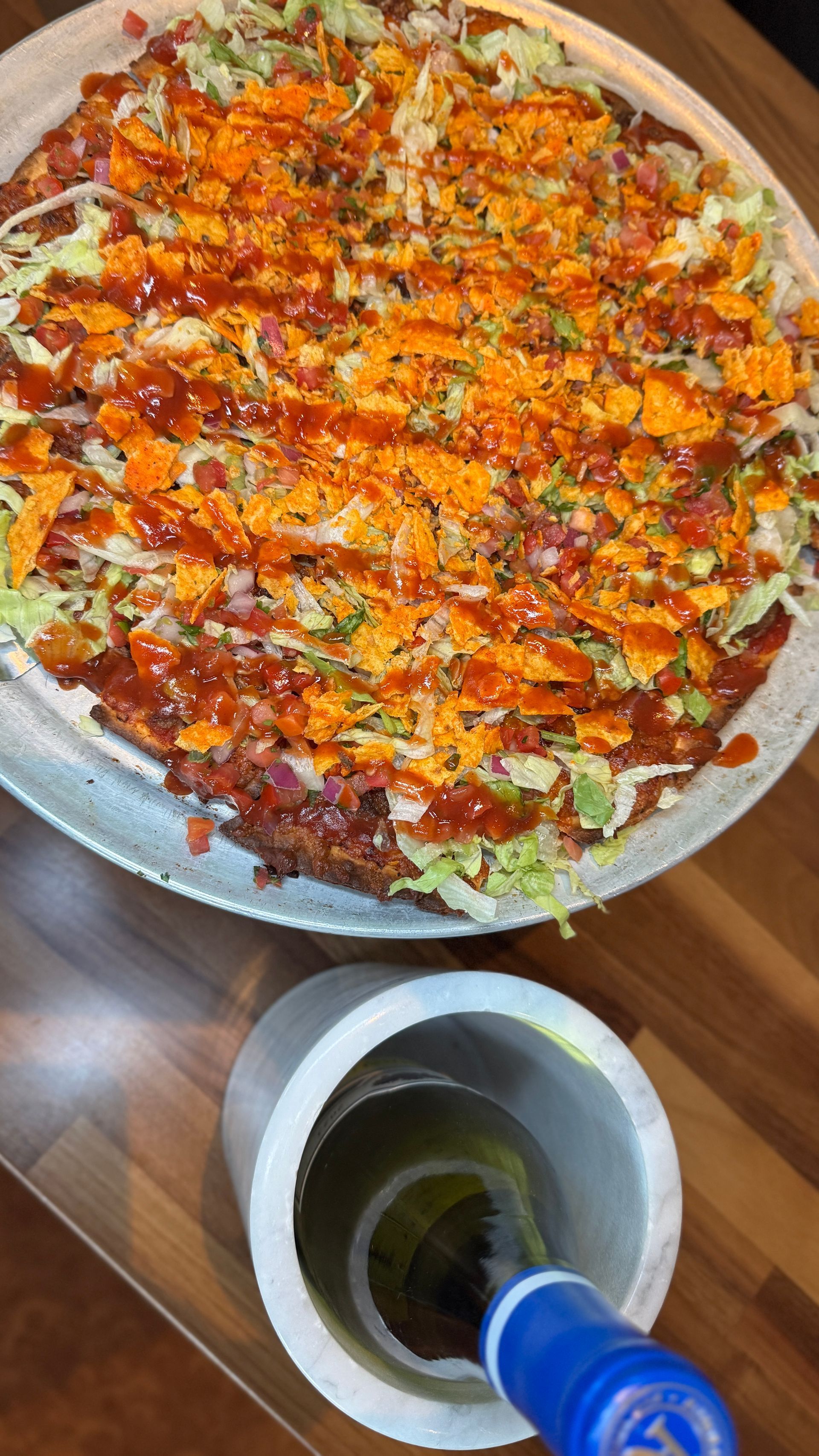 The pizza itself is a playful, layered creation. A base of seasoned beef. Lettuce and pico de gallo for freshness. Melted cheese for richness. And the final touch: a crumble of Doritos that gives the pizza a surprising crunch and a hit of nostalgic flavor.