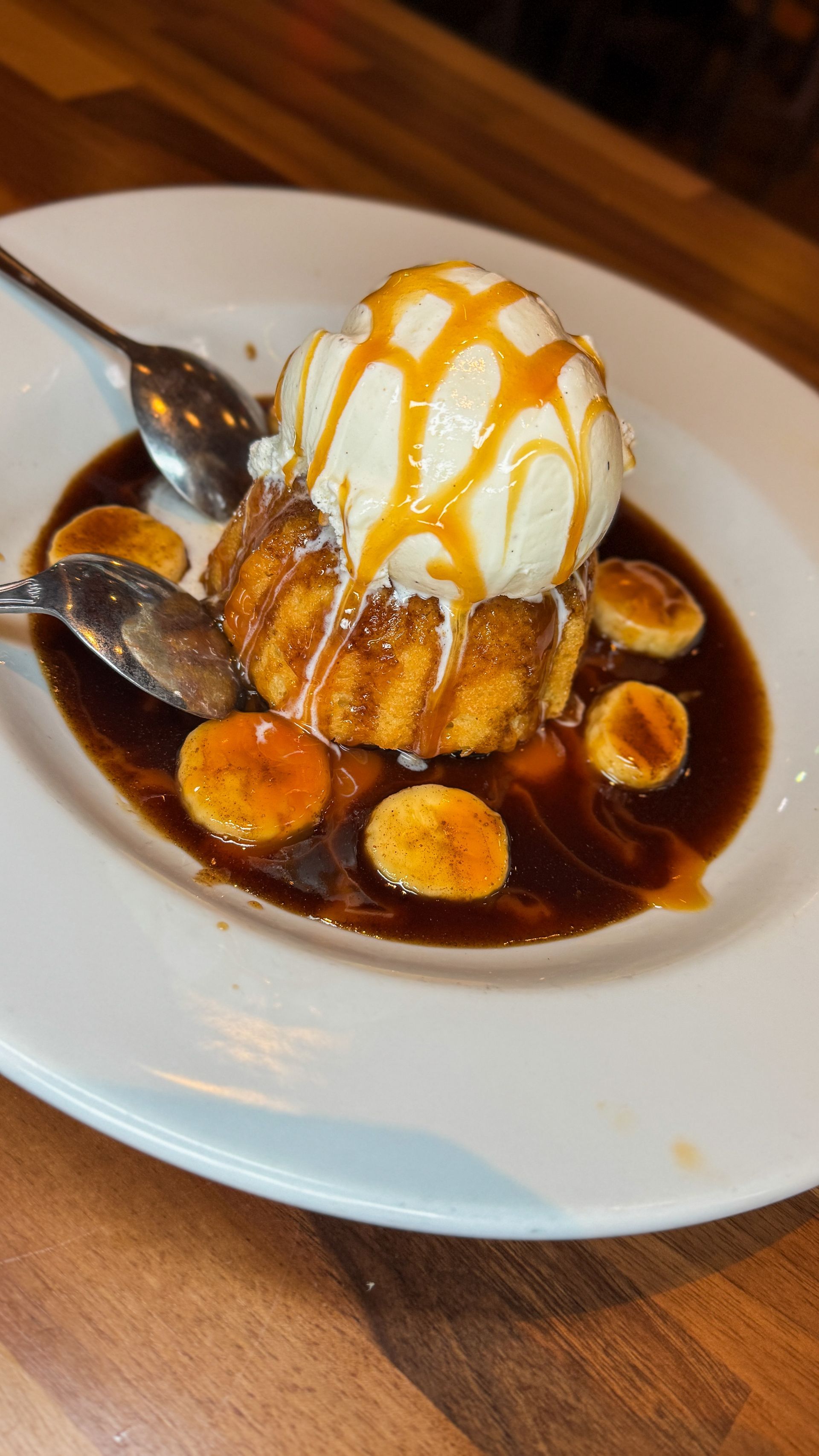 This dessert begins with a warm butter cake that is soft, moist, and aromatic. Caramelized bananas add sweetness and depth. Vanilla ice cream melts slowly over the top, creating a rich sauce that blends with the caramel and the cake.
