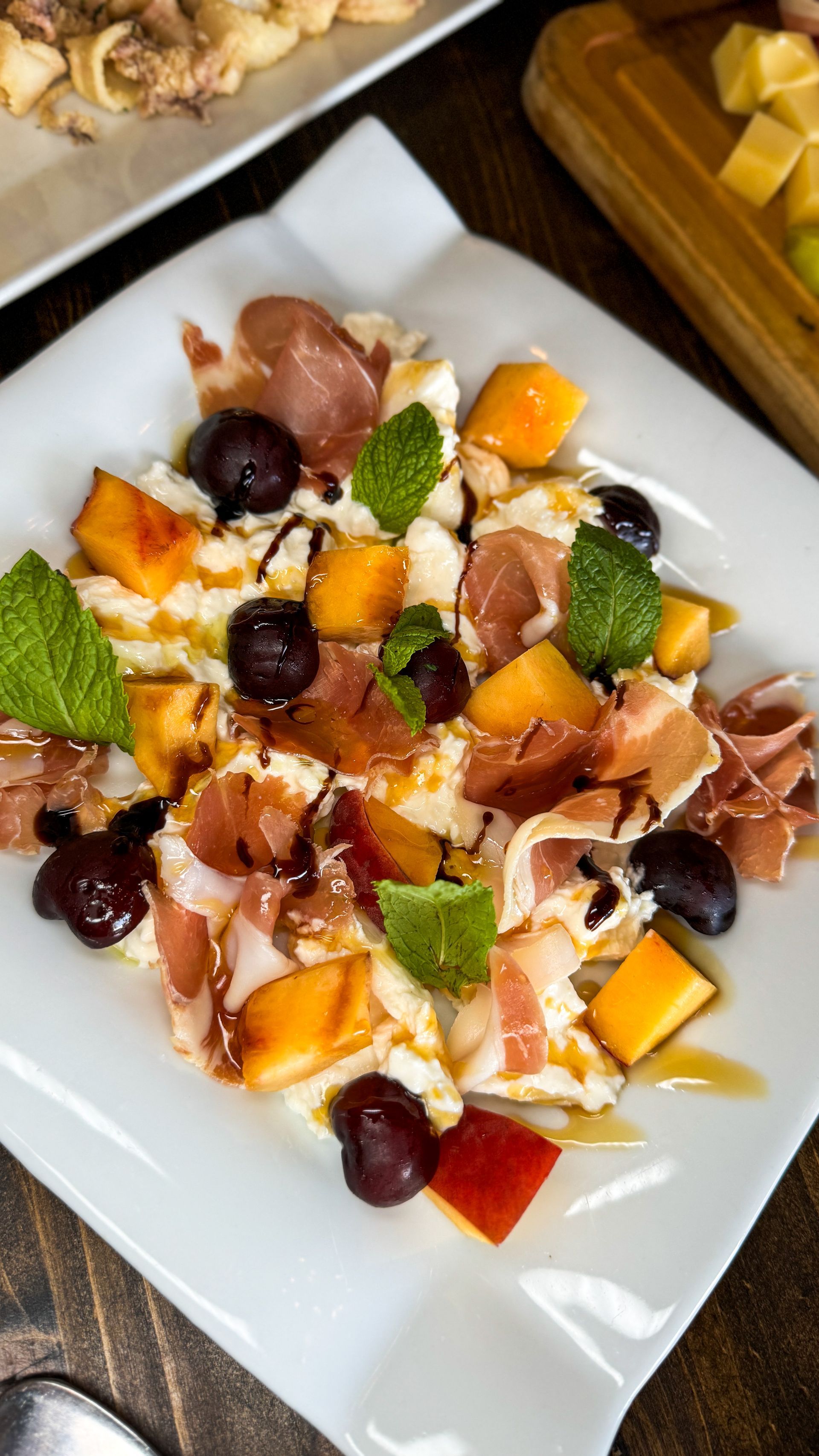 Creamy burrata meets sweet cherries and peaches, balanced with salty prosciutto and fresh mint. A well-composed starter that delivers contrast and complexity in every bite.