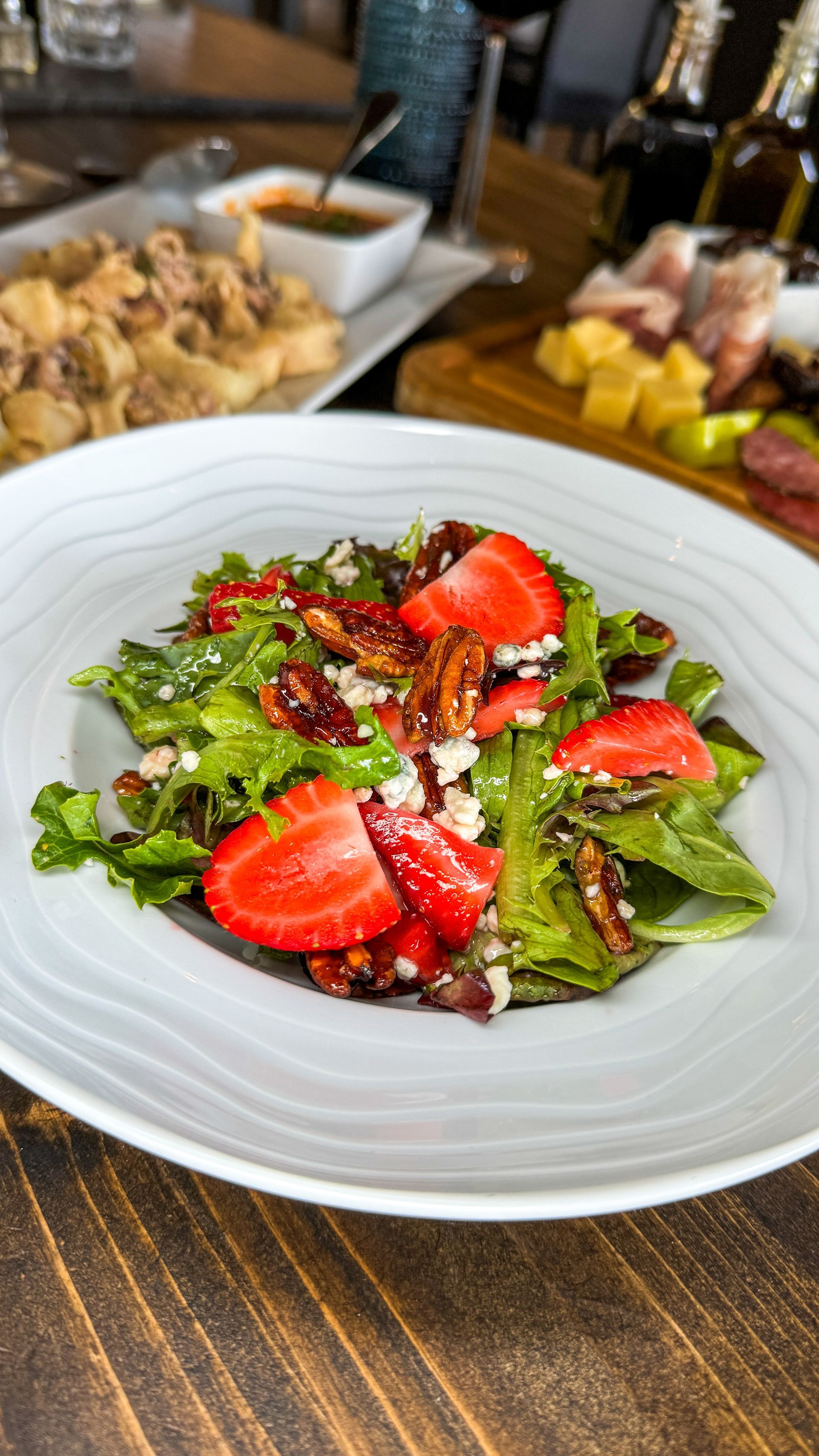 A lighter start, this salad combines fresh strawberries, crunchy pecans, blue cheese crumbles, and a raspberry walnut vinaigrette. Sweet, tangy, creamy, and fresh all at once.