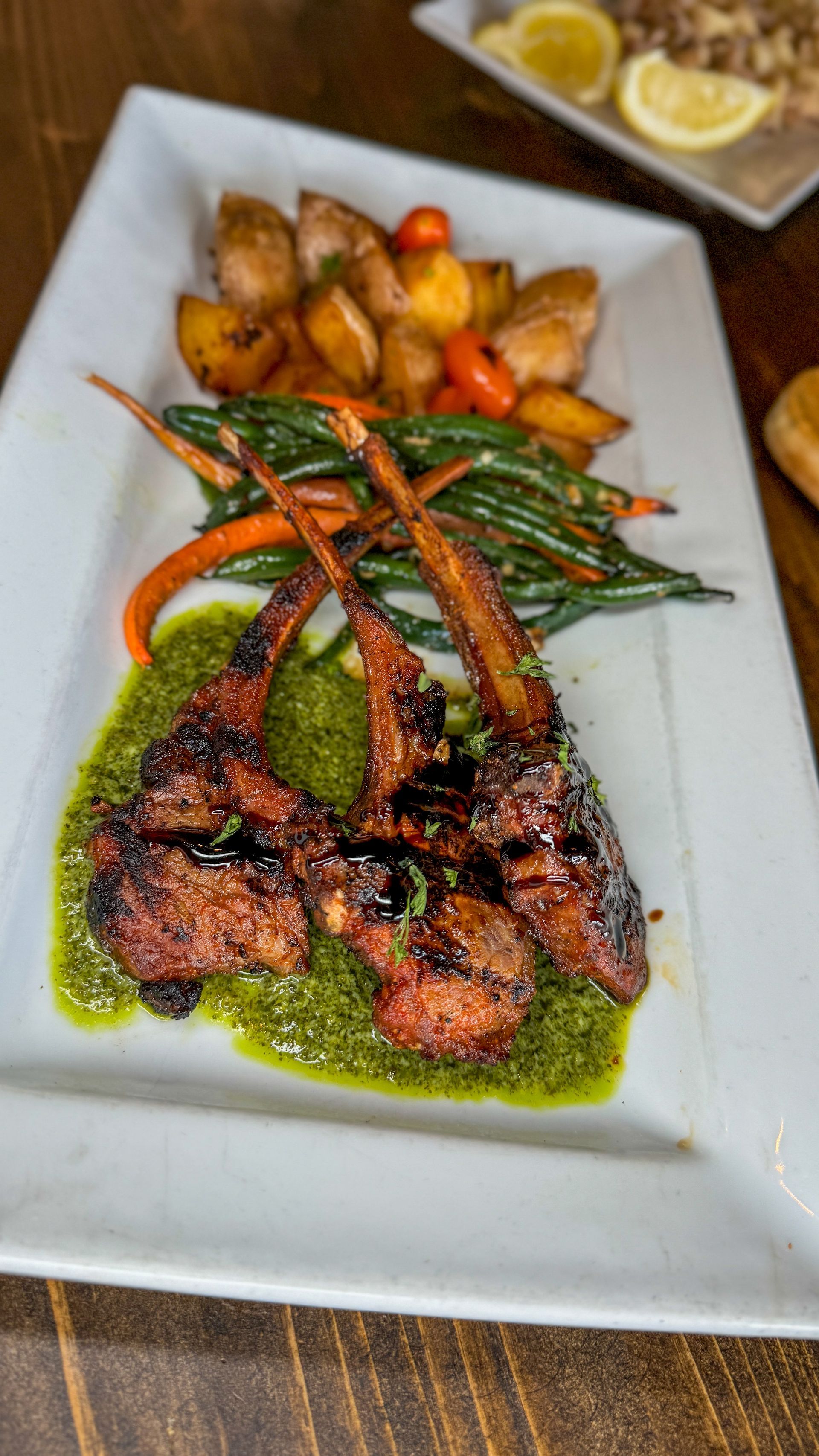 Cooked to perfection and served with garlic potatoes, pesto, and cherry tomatoes. The lamb is tender and flavorful, and the accompaniments add color and brightness to the dish.